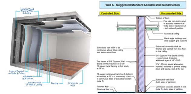 – Walls: Wall assemblies may include RF shielding, multi-layer gypsum board, foil-backed panels, and continuous acoustic sealants. Paints and coatings may also require anti-scratch or clean-room properties.